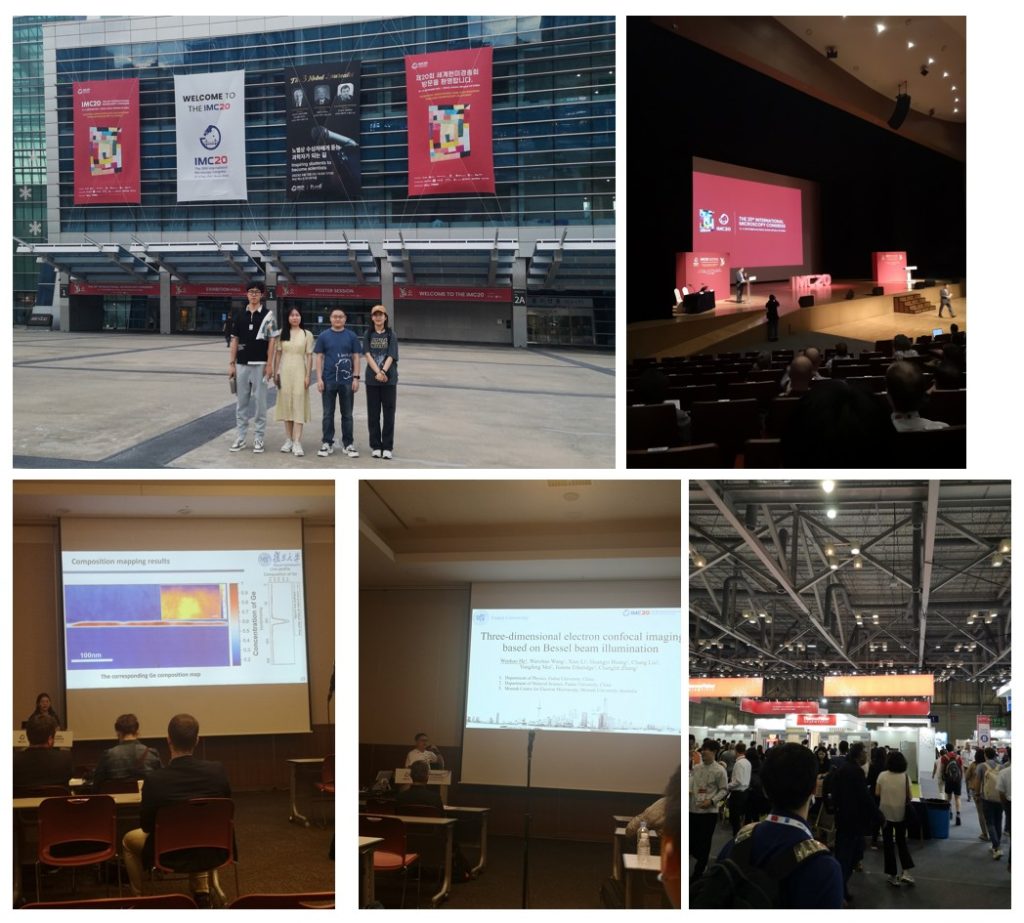 王文钊、何文浩、黄广艺、张佳芮四位博士生赴韩国釜山参加四年一度的国际显微学大会(IMC 19)。何文浩同学做了Three dimenional electron confocal imaging based on Bessel illumination的口头报告,张佳芮同学做了Quantitative composition analysis of semiconductor nanostructures with pixelated STEM的口头报告。王文钊和黄广艺同学分别进行了Poster展示。