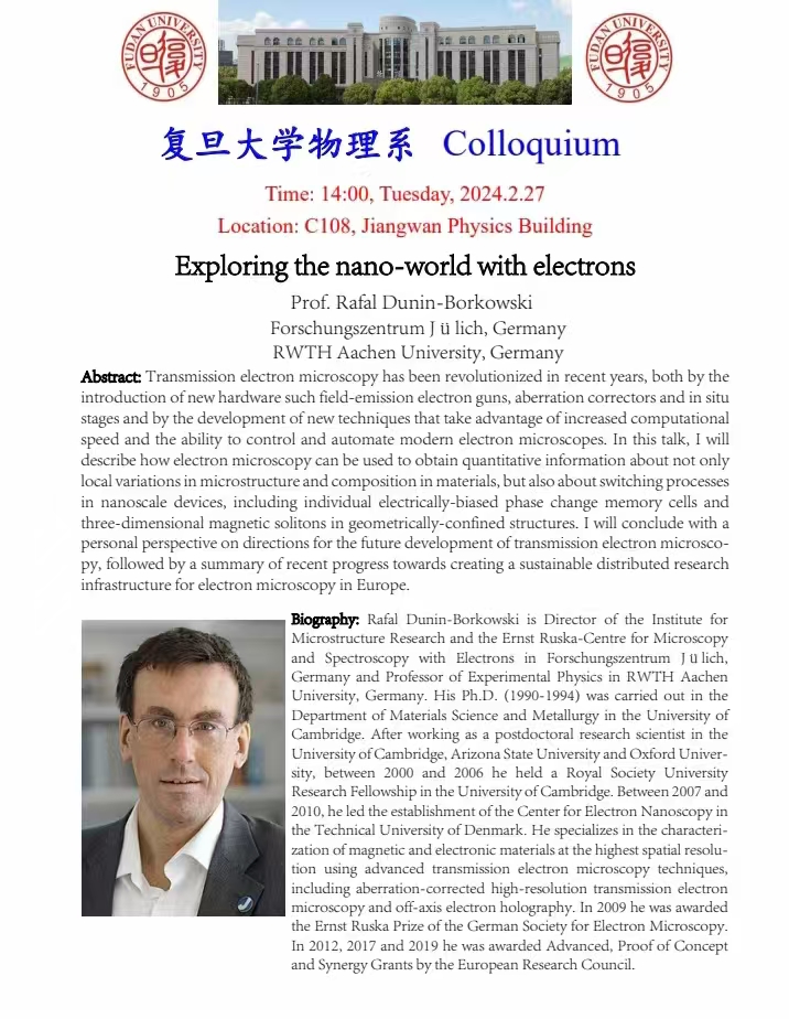 德国Julich Ensta Ruska电镜中心主任Rafal E. Dunin‑Borkowski教授访问课题组,并在物理学系Colloqium做了题为Exploring the nano-world with electrons的学术报告。